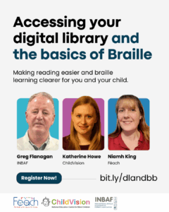 WEBINAR – Join Féach, ChildVision and INBAF Irish National Braille & Alternative Formats Authority as we discuss ChildVisions NEW Online Bookshelf with Katharine and Greg from INBAF will teach us about the Perkins brailler and the basics of Braille. November 18th at 8pm. Click here to register