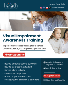 Féach offers in person or online training for school staff who have a new visually impaired pupil in their class or school. Suitable for Croke Park hours. We offer this training for free. Email niamh.king@feach.ie for more details