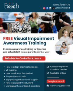 Suitable for Croke Park hours and is available for any school with a visually impaired student. In collaboration with Empatheyes we use VR headsets to assist the staff in understanding the students level of vision and how it affects their day to day experiences in school. This session lasts approx 1 hour. To register email niamh.king@feach.ie